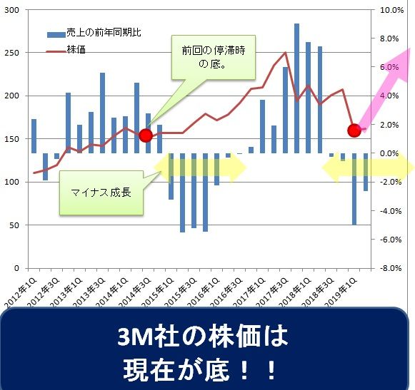 なぜなら、既に3M社のマイナス成長は1年に及んでおり、あと1年程度で回復に向かうと予測できるからです。株価はそれに先駆けて動きますから、そろそろ底と見て良いでしょう。