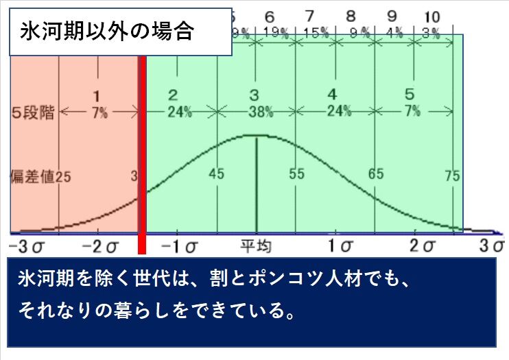 赤いゾーンがかなり左のほうにシフトしています。左のほうは低偏差値の人材を表します。すなわち、わりとポンコツ人材でも、それなりに暮らしていけたことを表します。