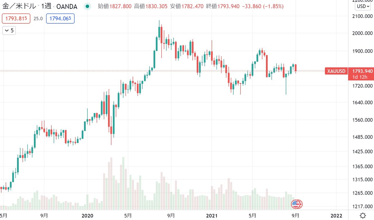 現在は、テーパリングの開始が近い、つまり、金融緩和が終了しつつあります。金融緩和の時は、国債を買っても金利が低いので儲かりませんから、ゴールドが選好されます。実際、コロナショック後の大規模な金融緩和政策のもとにおいて、ゴールドの価格がどんどん上昇してきました。