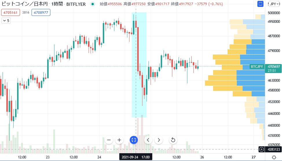 かなり厳しい内容でしたので、ビットコイン価格は、ニュースが出回った9月24日(金)夕方におよそ500万円から450万円に急落、実に10%もの大きな下げに見舞われました。こちらがそのときの値動き(1時間足)です。